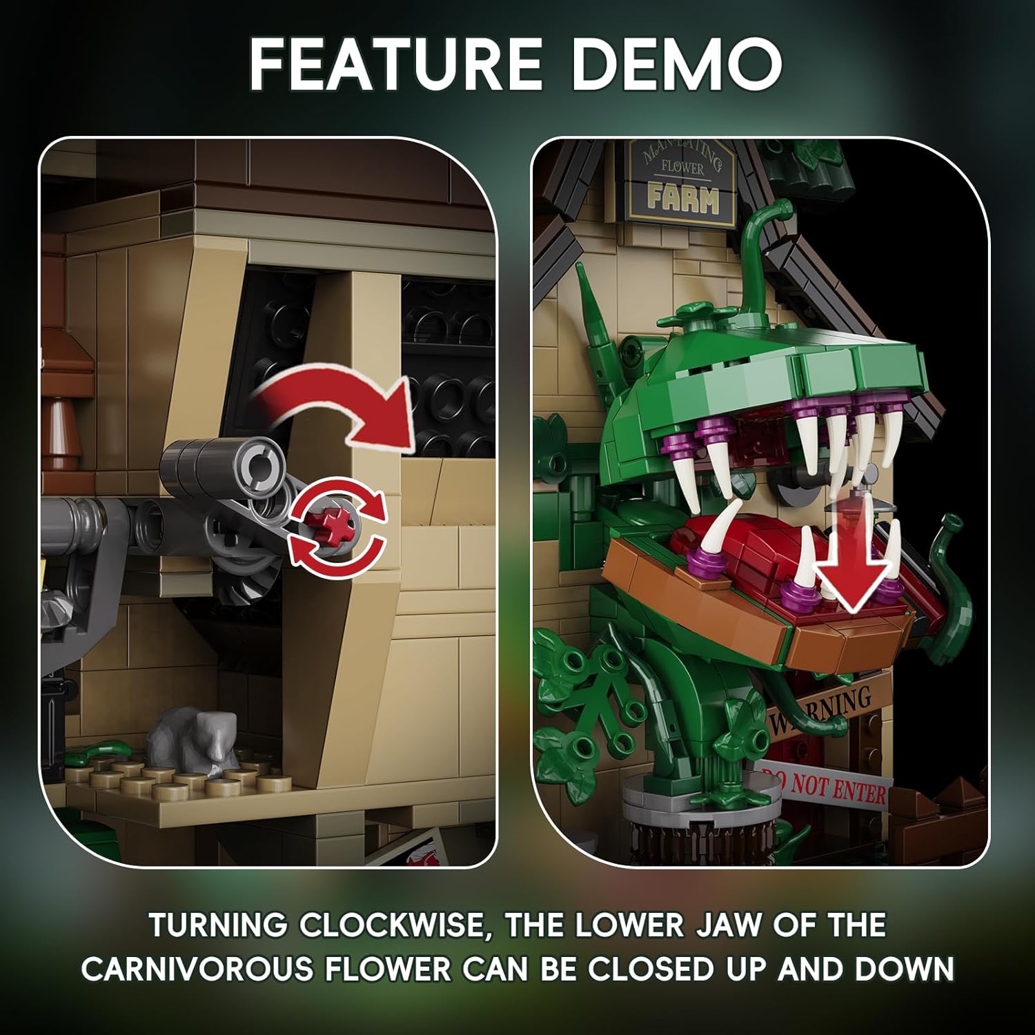 - Intricate Horror Details:Every corner tells a scary story. The set features detailed "WARNING: DO NOT ENTER" and "Man-Eating Flower FARM" wooden signs, boarded-up windows, and smaller predatory plants lurking on the chimney. The contrast between the rustic cottage architecture and the vibrant, menacing green monsters creates a striking visual impact