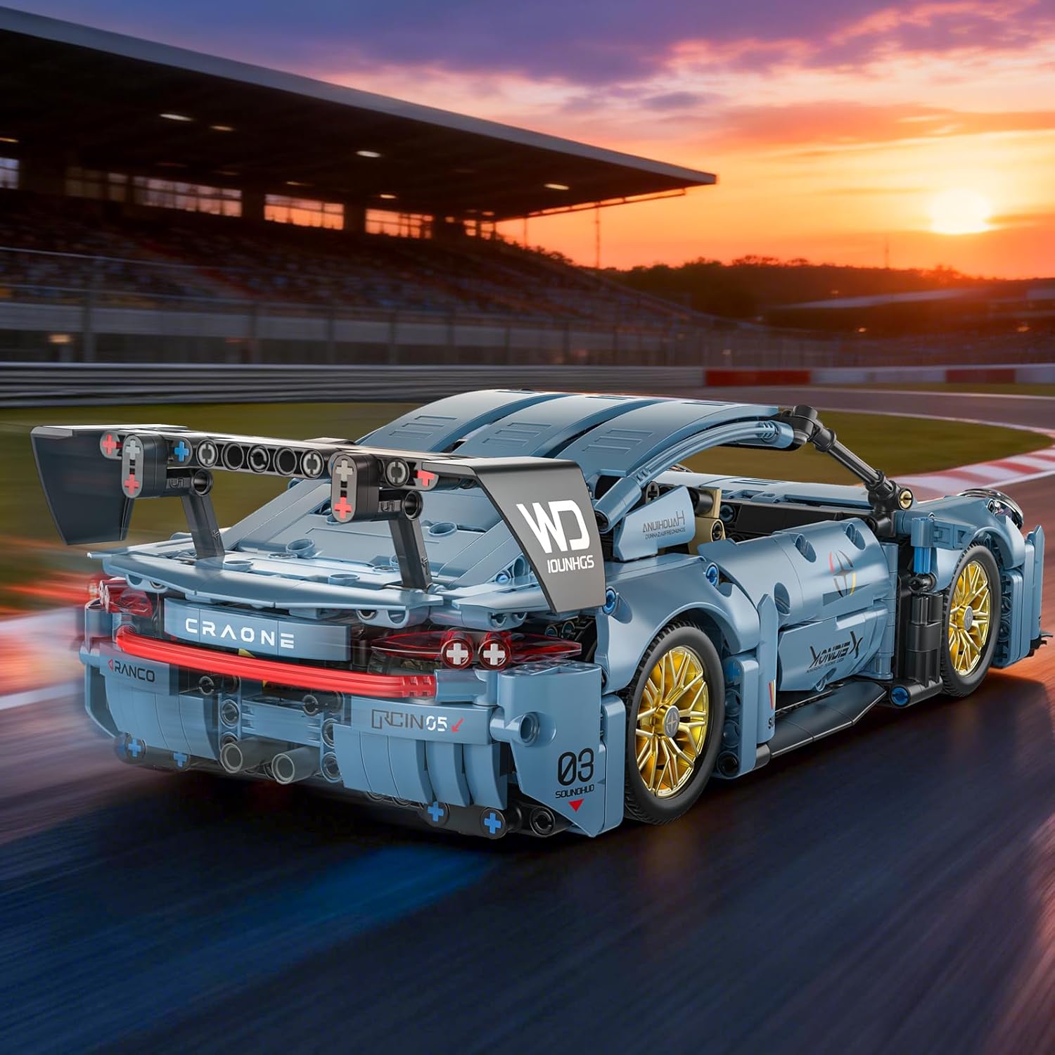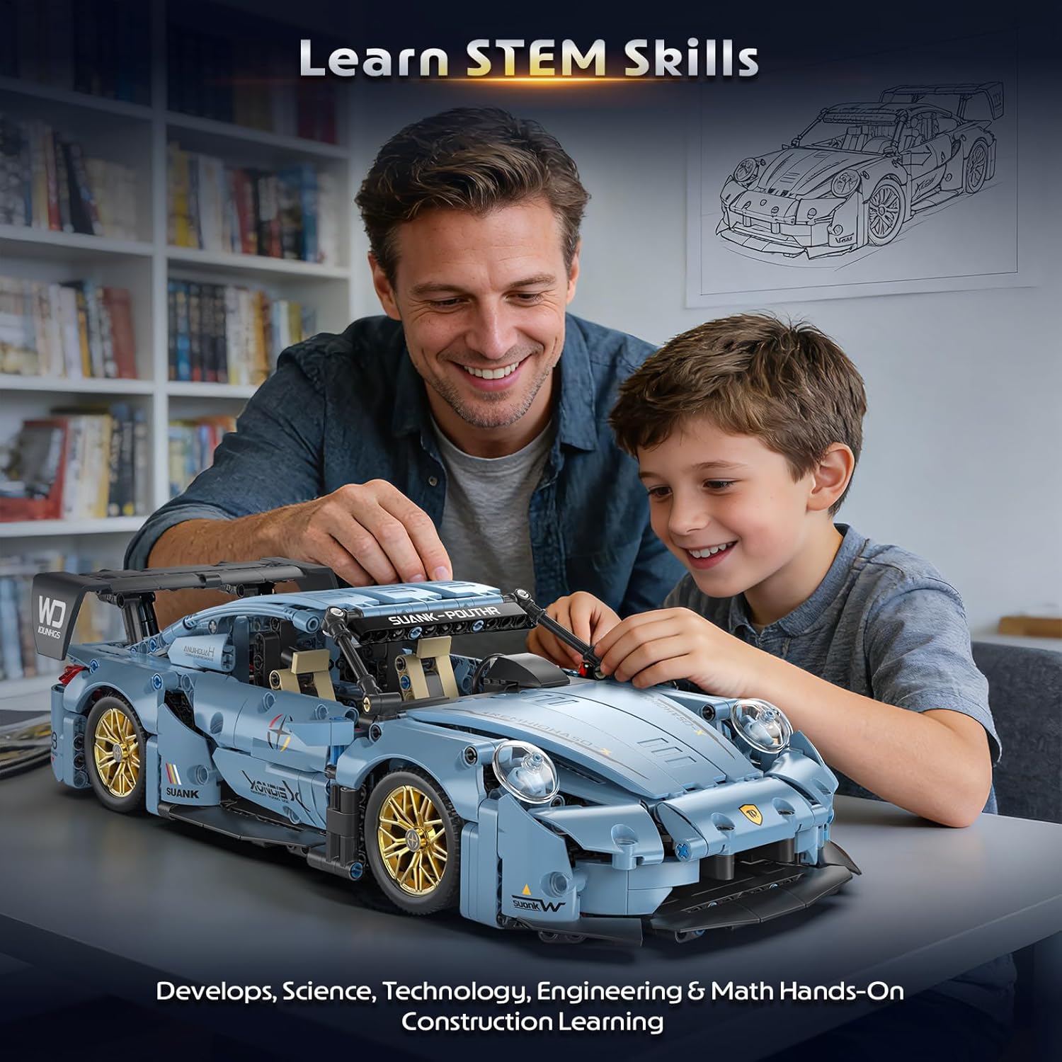 1:14 scale futuristic sports car building kit (973PCS), with streamlined body, openable doors, detailed cockpit and movable wheels (size: 14.17*7.09*3.94 inches). It offers immersive assembly, relieves stress and brings a sense of achievement, while helping develop STEM skills, logical thinking and fine motor skills (great for parent-child bonding). Made of high-quality ABS, compatible with major brick brands, with clear instructions. It’s a collectible display and ideal birthday/holiday gift for teens, boys and adults.