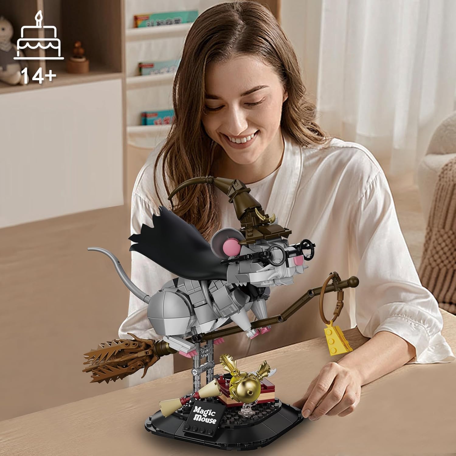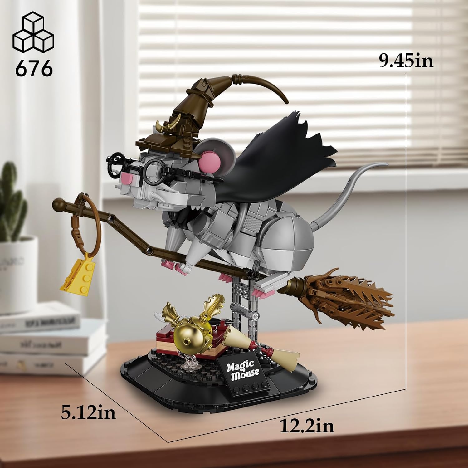 Made with 676 high-quality ABS bricks, this set builds a whimsical wizard mouse riding a broomstick, complete with a witch hat, black cape, round glasses, and a detailed base with a Golden Snitch, magic wand, and book.