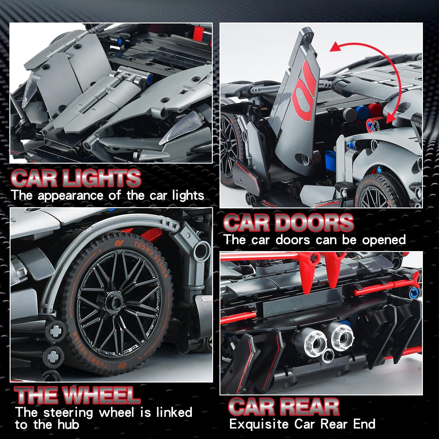 Features opening doors, synchronized steering, and detailed headlights, seats and wheels, showcasing the car’s power and mechanical aesthetics for an immersive assembly.